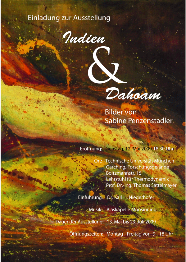 Das Thema 2009 ist "Indien & Dahoam". Die aus Passau stammende Künstlerin Sabine Penzenstadler stellt am 12.05.09 ab 18:30 Uhr ihr Reisetagebuch "BIN in Indien" vor, das im Mai in einer limitierten Auflage erscheinen wird. Ihr Ziel war "Nix wie weg". Von ihrer Reise, die sie nach Rajasthan und in einige Orte in Nordindien führte, brachte sie uns ein ganzes Skizzenbuch mit traumhaften Eindrücken und Fotos mit. Des Weiteren stellt sie Bodyprints auf Leinwand der vergangenen Jahre und neue Monotypien auf Seide vor. Die Blaskapelle Moosinning vertritt musikalisch die bayrische Heimat, in die die Künstlerin nach ihrem ausgelebten Fernweh immer wieder gerne zurückkehrt.